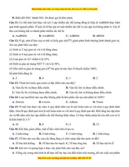 Câu 11: Cơ thể một loài thực vật xét 3 cặp nhiễm sắc thể tương đồng kí hiệu là AaBbDd thực hiện