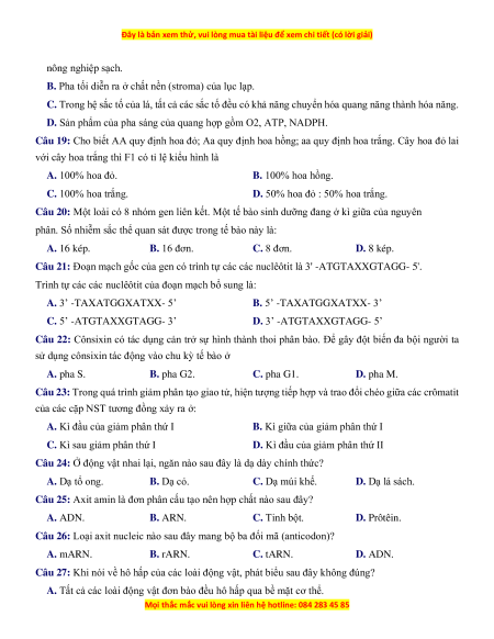Câu 19: Cho biết AA quy định hoa đỏ; Aa quy định hoa hồng; aa quy định hoa trắng. Cây hoa đỏ lai