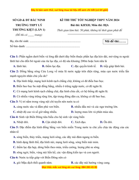 Đề thi thử tốt nghiệp THPT 2024 Địa lí (từ Trường/Sở)