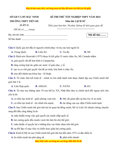 TRƯỜNG THPT TIÊN DU Môn thi: LỊCH SỬ (LẦN 1)