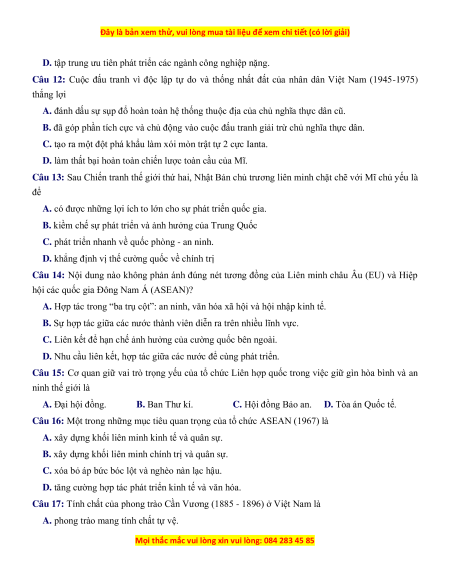 Câu 16: Một trong những mục tiêu quan trọng của tổ chức ASEAN (1967) là