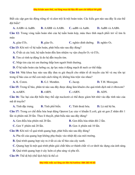 Câu 11: Một quần thể thực vật có alen A bị đột biến thành alen a, alen B bị đột biến thành alen b.