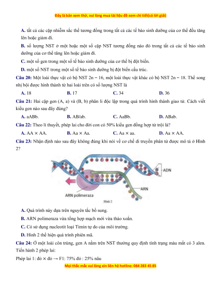 Câu 20: Một loài thực vật có bộ NST 2n = 16, một loài thực vật khác có bộ NST 2n = 18. Thể song