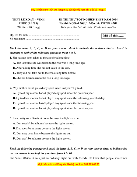 KÌ THI THỬ TỐT NGHIỆP THPT NĂM 2024 PHÚC (LẦN 1)
