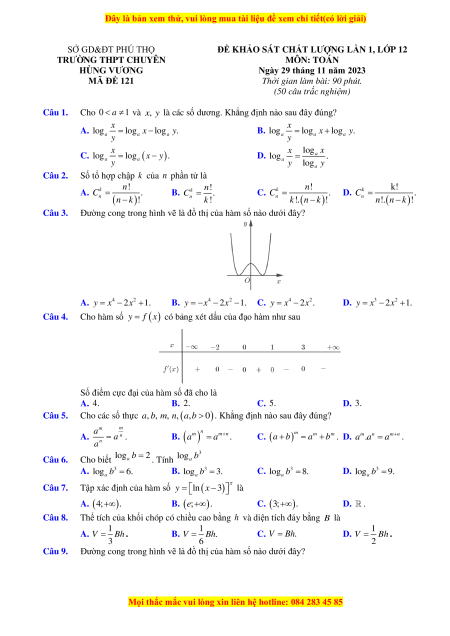 Đề thi thử tốt nghiệp Toán trường THPT Chuyên Hùng Vương lần 1 năm 2024
