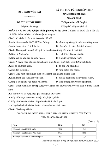 Đề thi thử tốt nghiệp THPT 2025 Địa lí Sở Yên Bái