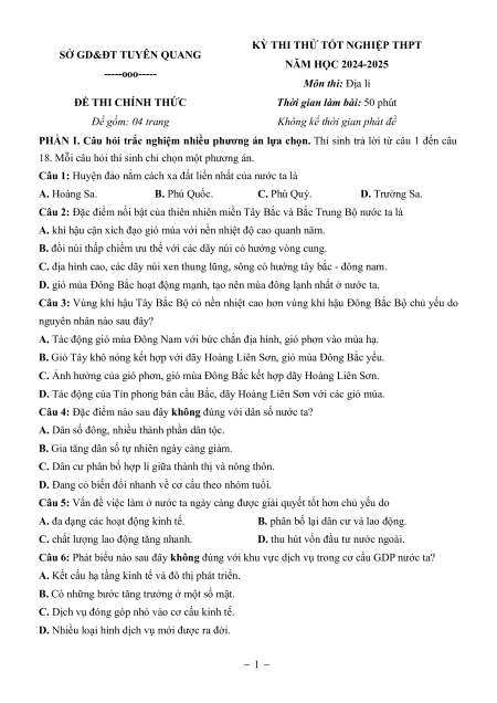 SỞ GD&ĐT TUYÊN QUANG NĂM HỌC 2024-2025 -----ooo-----