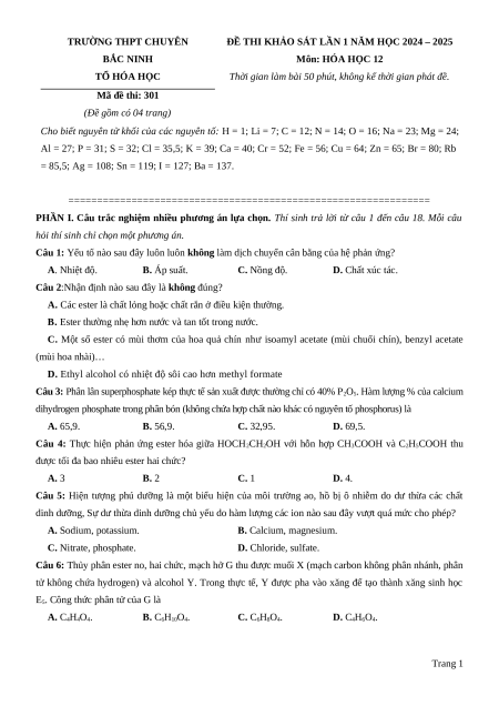 ĐỀ THI KHẢO SÁT LẦN 1 NĂM HỌC 2024 – 2025 BẮC NINH Môn: HÓA HỌC 12 TỔ HÓA HỌC