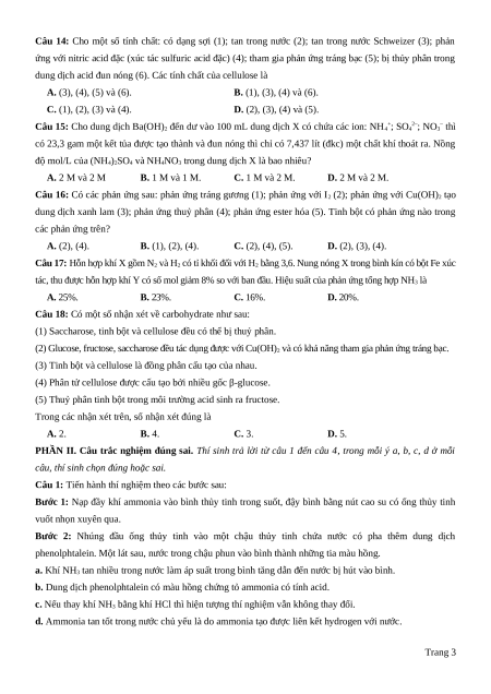 Câu 14: Cho một số tính chất: có dạng sợi (1); tan trong nước (2); tan trong nước Schweizer (3); phản