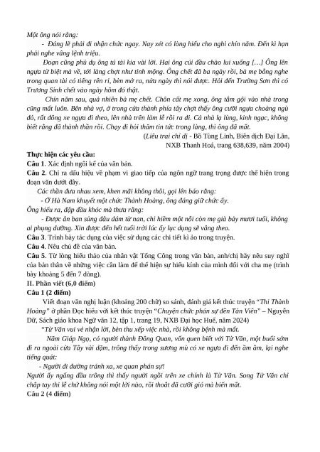 I/ Phần Đọc hiểu (4 điểm) Đọc văn bản: THI THÀNH HOÀNG