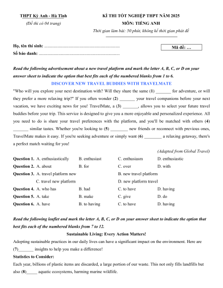 Đề thi thử tốt nghiệp THPT 2025 Tiếng Anh (từ Trường/Sở)
