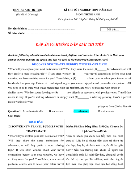 Question 1. A. enthusiastically B. enthusiast C. enthusiasm D. enthusiastic Question 2. A. about B. for C. over D. with