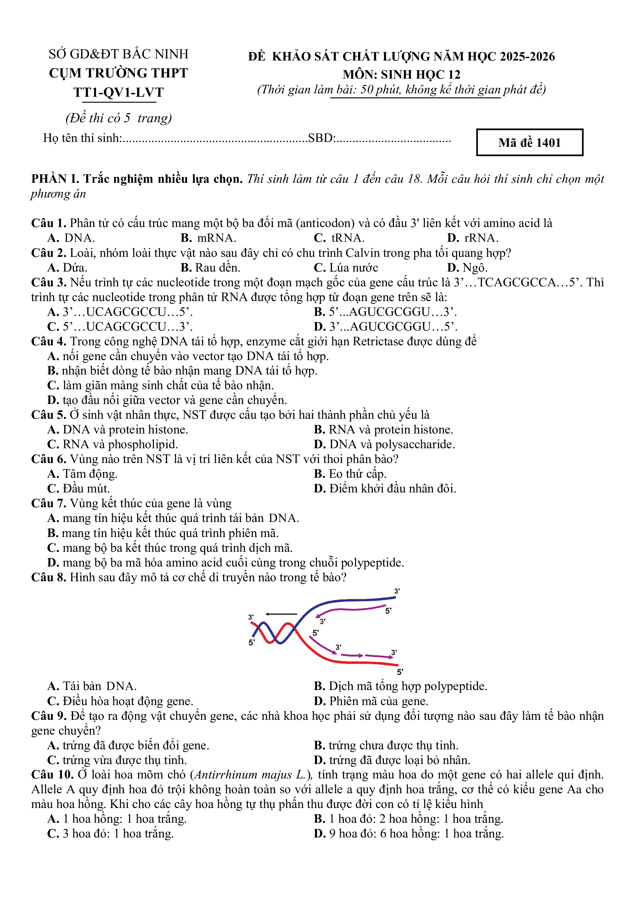 ĐỀ KHẢO SÁT CHẤT LƯỢNG NĂM HỌC 2025-2026 CỤM TRƯỜNG THPT MÔN: SINH HỌC 12 TT1-QV1-LVT