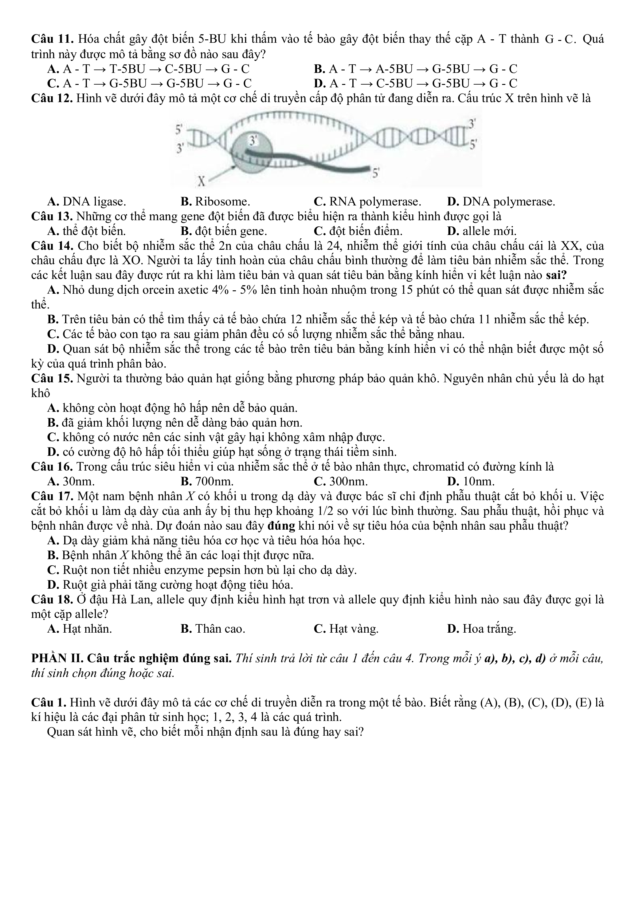 Câu 11. Hóa chất gây đột biến 5-BU khi thấm vào tế bào gây đột biến thay thế cặp A - T thành G - C. Quá