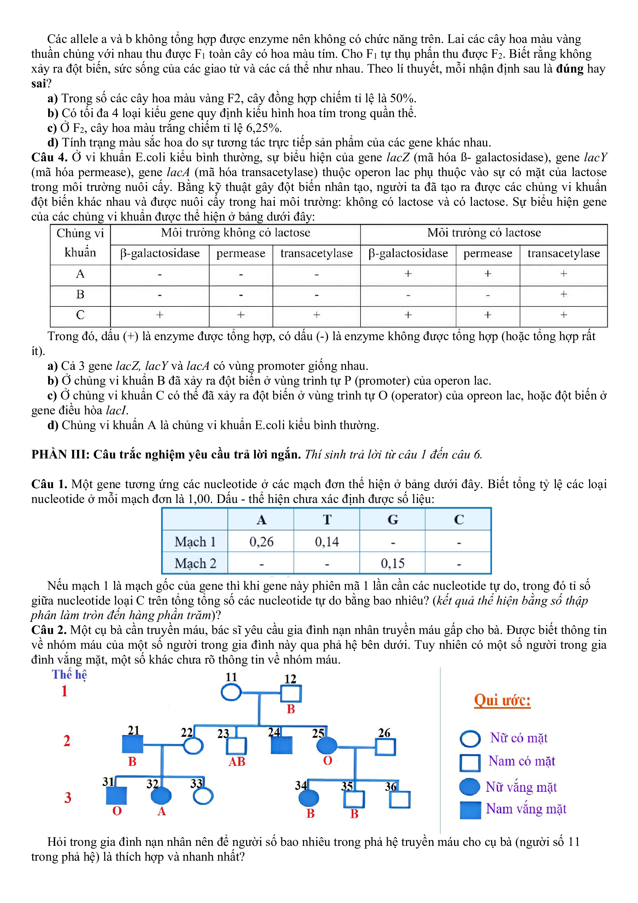 Câu 4. Ở vi khuẩn E.coli kiểu bình thường, sự biểu hiện của gene lacZ (mã hóa ß- galactosidase), gene lacY