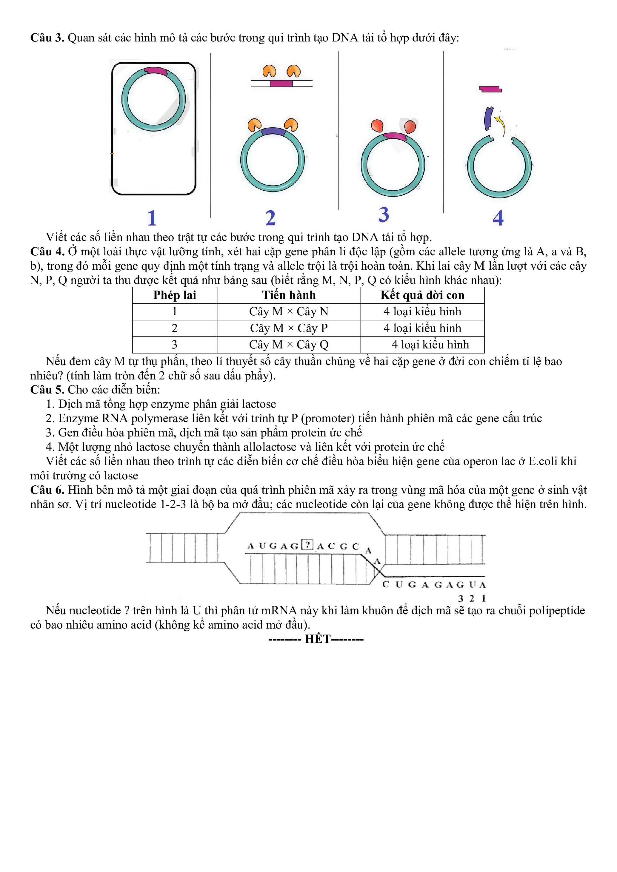 Câu 3. Nếu trình tự các nucleotide trong một đoạn mạch gốc của gene cấu truc là 3’…TCAGCGCCA…5’. Thì