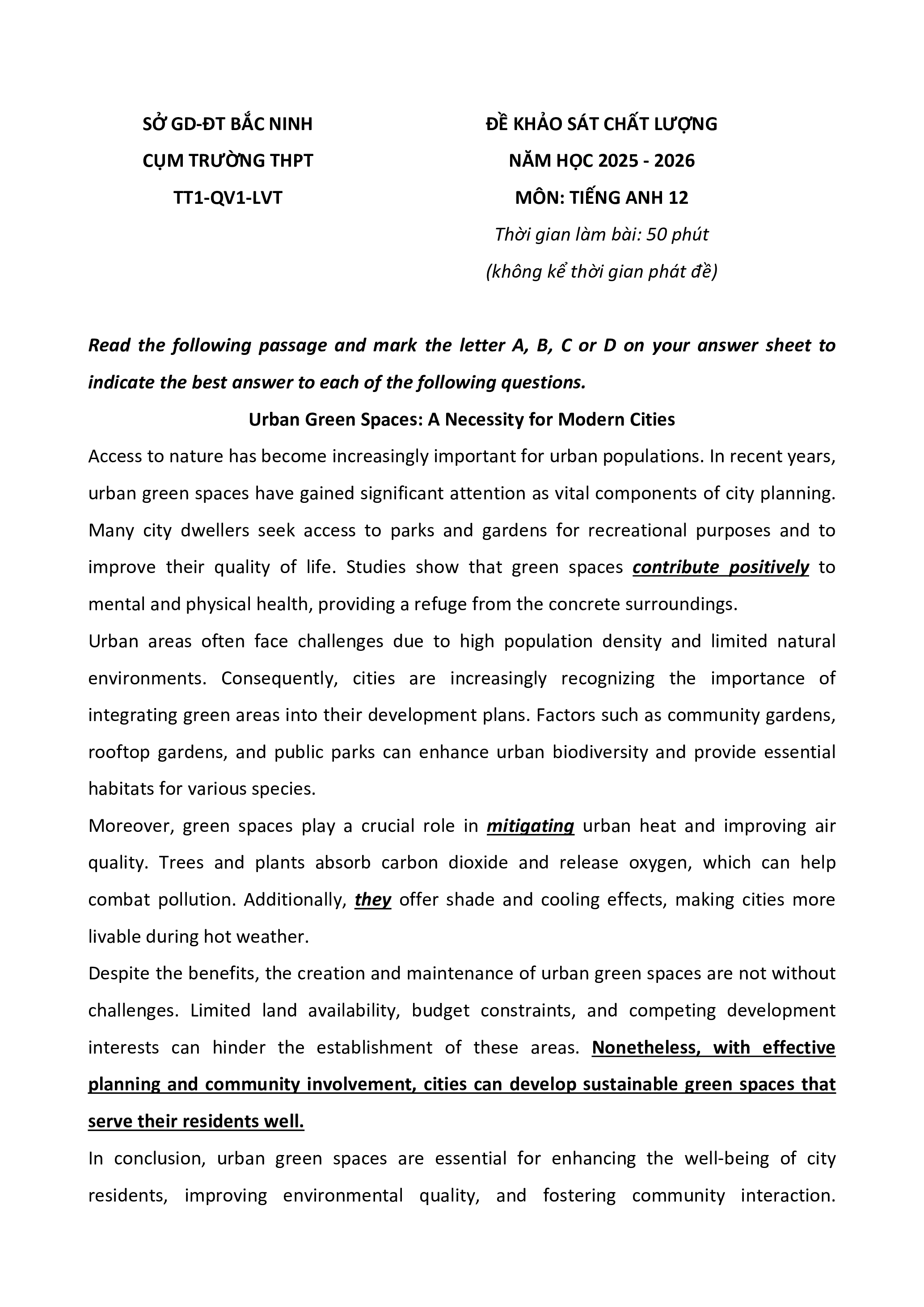 ĐỀ KHẢO SÁT CHẤT LƯỢNG CỤM TRƯỜNG THPT NĂM HỌC 2025 - 2026 TT1-QV1-LVT MÔN: TIẾNG ANH 12