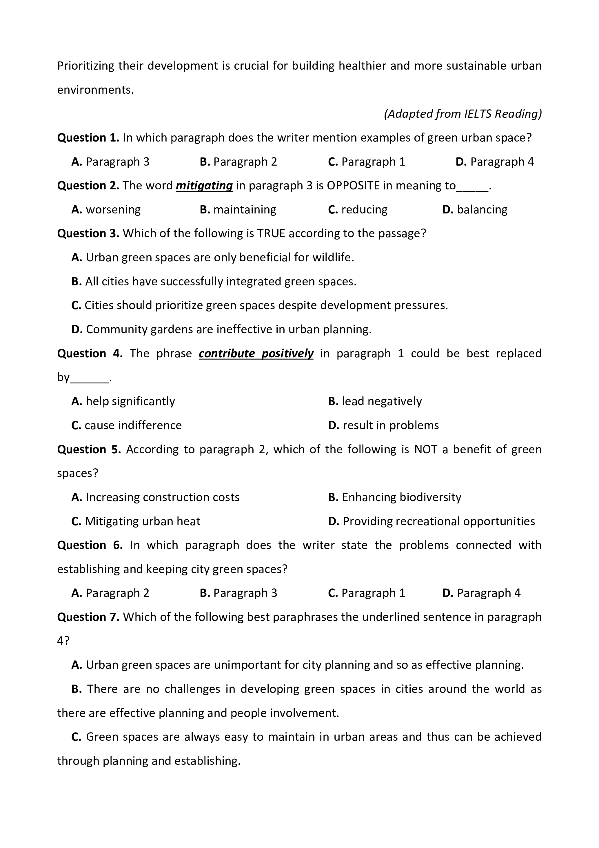 Question 1. In which paragraph does the writer mention examples of green urban space? A. Paragraph 3 B. Paragraph 2 C. Paragraph 1 D. Paragraph 4