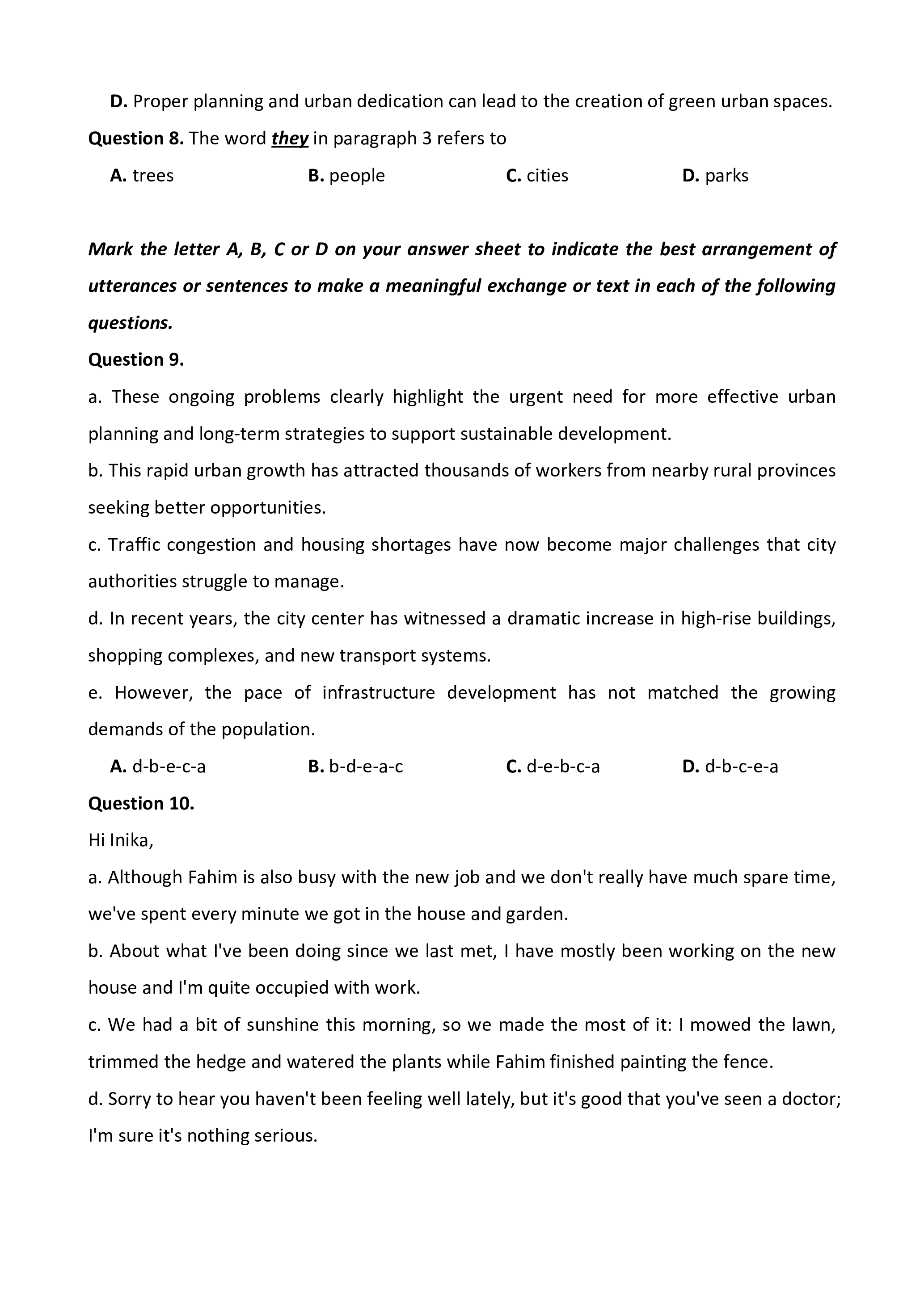 e. However, the pace of infrastructure development has not matched the growing demands of the population. A. d-b-e-c-a B. b-d-e-a-c C. d-e-b-c-a D. d-b-c-e-a Question 10. Hi Inika,