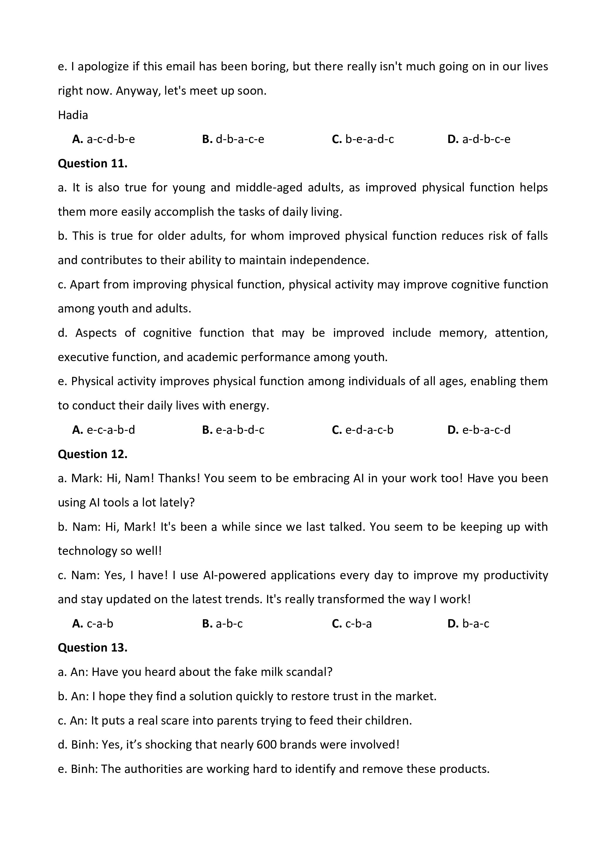right now. Anyway, let's meet up soon. Hadia A. a-c-d-b-e B. d-b-a-c-e C. b-e-a-d-c D. a-d-b-c-e Question 11.