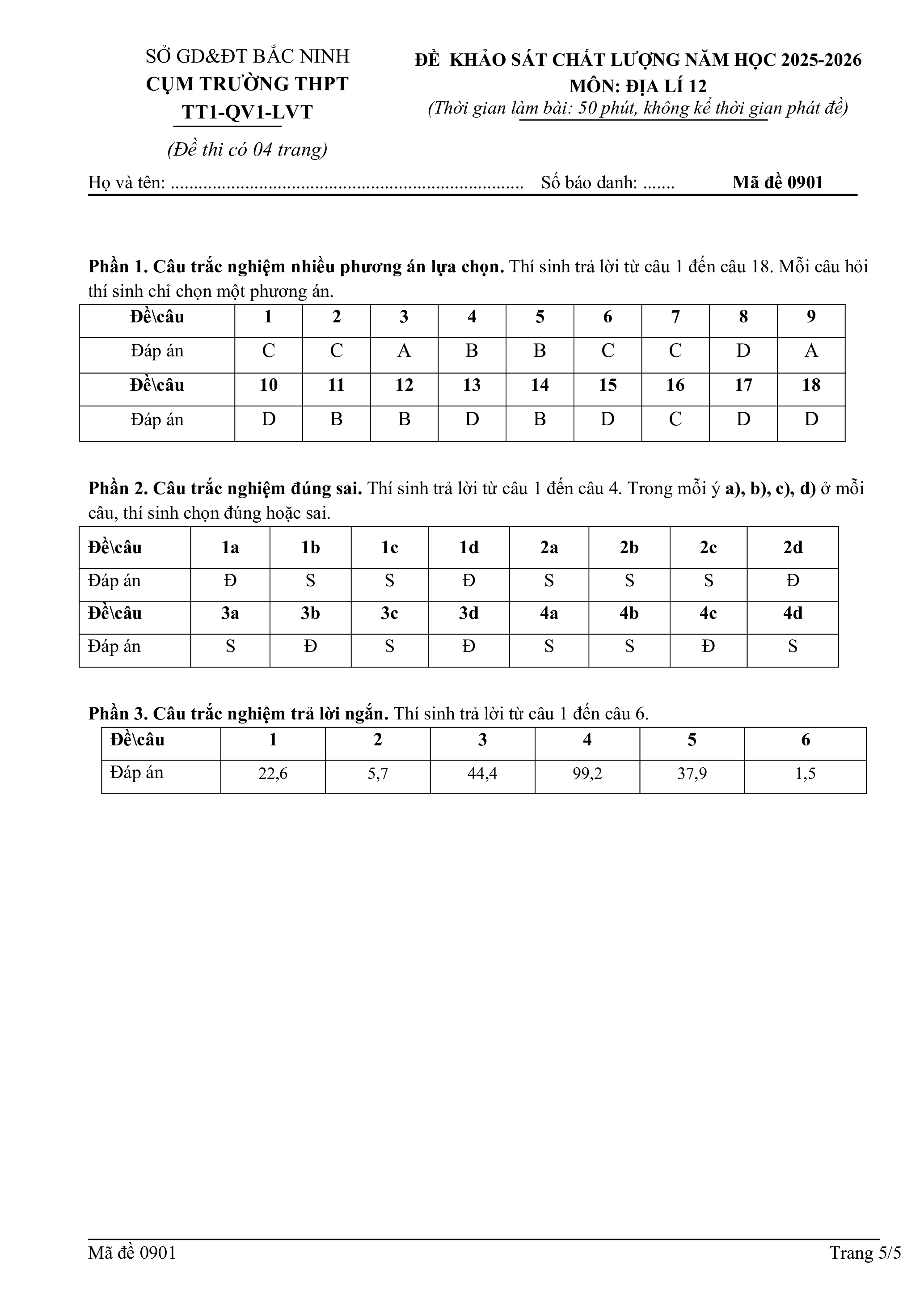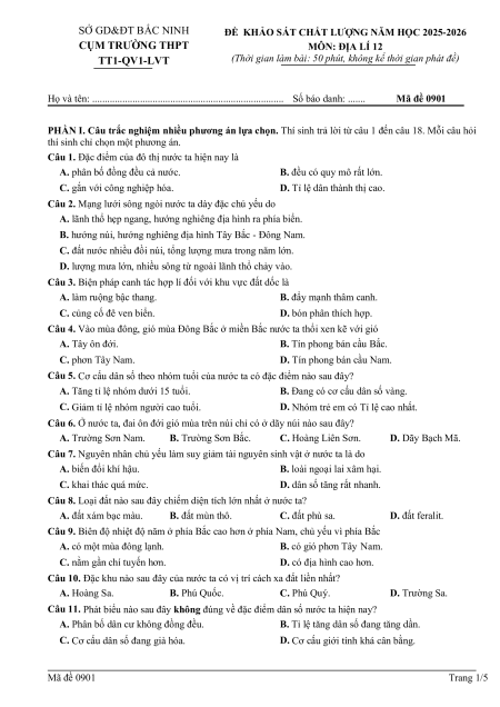 ĐỀ KHẢO SÁT CHẤT LƯỢNG NĂM HỌC 2025-2026 CỤM TRƯỜNG THPT MÔN: ĐỊA LÍ 12 TT1-QV1-LVT