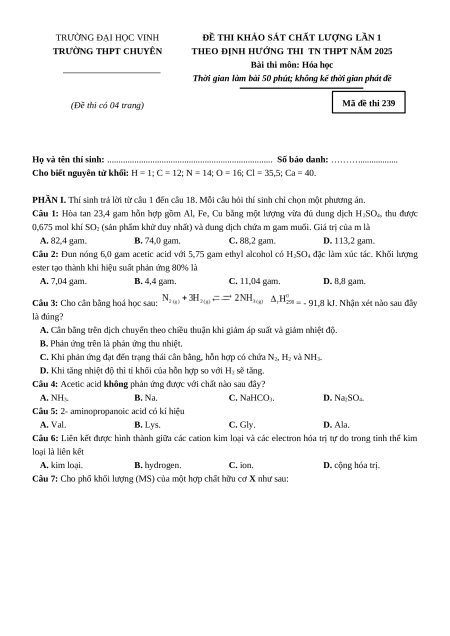 Đề thi thử tốt nghiệp THPT Hóa học chuyên Đại học Vinh năm 2025
