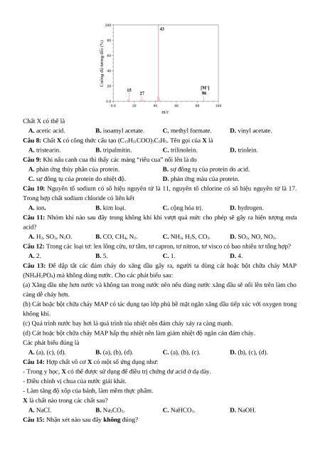Câu 7: Cho phổ khối lượng (MS) của một hợp chất hữu cơ X như sau: Chất X có thể là A. acetic acid. B. isoamyl acetate. C. methyl formate. D. vinyl acetate.