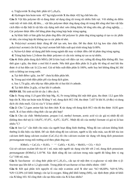 d. Hydrogen hóa hoàn toàn 427 kg triglyceride X thu được 432 kg chất béo rắn.