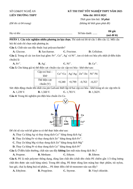 KỲ THI THỬ TỐT NGHIỆP THPT NĂM 2025 LIÊN TRƯỜNG THPT Môn thi: HOÁ HỌC