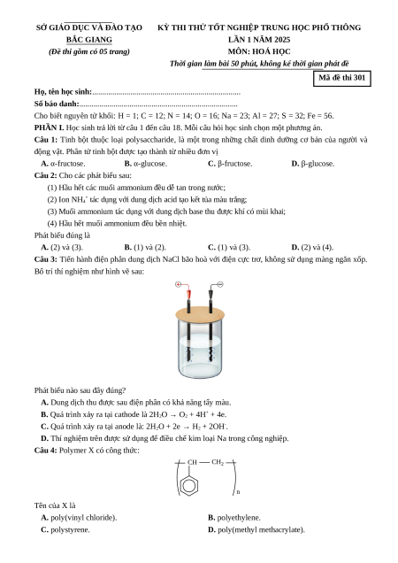 Đề thi thử tốt nghiệp THPT Hóa học Sở Bắc Giang - Lần 1 năm 2025