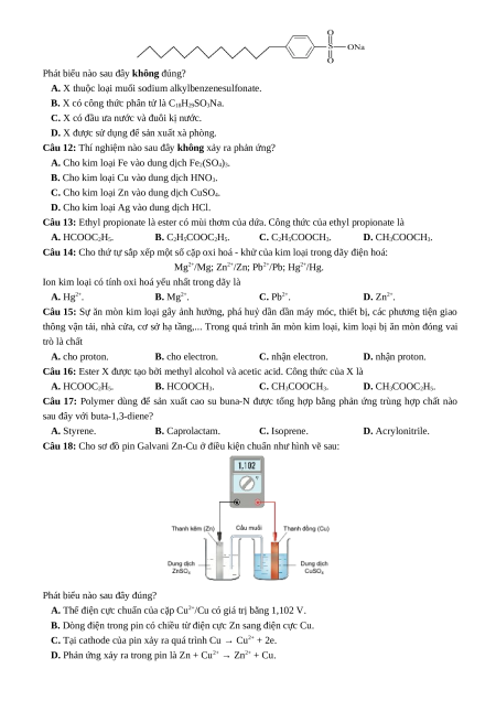 Câu 18: Cho sơ đồ pin Galvani Zn-Cu ở điều kiện chuẩn như hình vẽ sau: