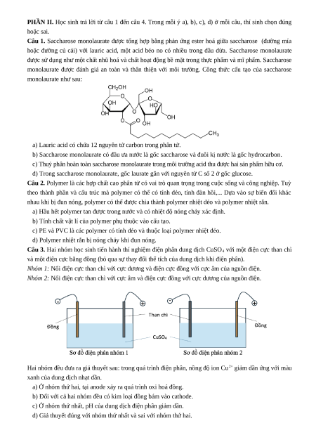 PHẦN II. Học sinh trả lời từ câu 1 đến câu 4. Trong mỗi ý a), b), c), d) ở mỗi câu, thí sinh chọn đúng hoặc sai.