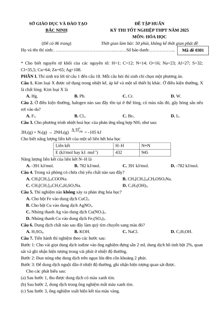 Đề thi thử tốt nghiệp THPT Hóa học Sở Bắc Ninh năm 2025