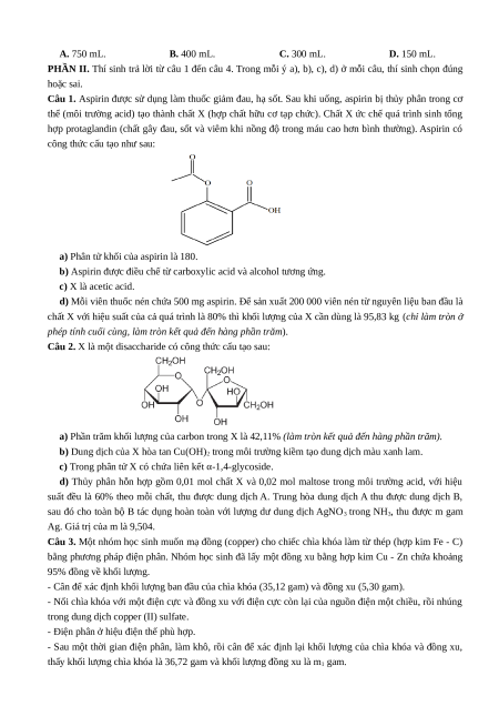 Câu 1. Aspirin được sử dụng làm thuốc giảm đau, hạ sốt. Sau khi uống, aspirin bị thủy phân trong cơ