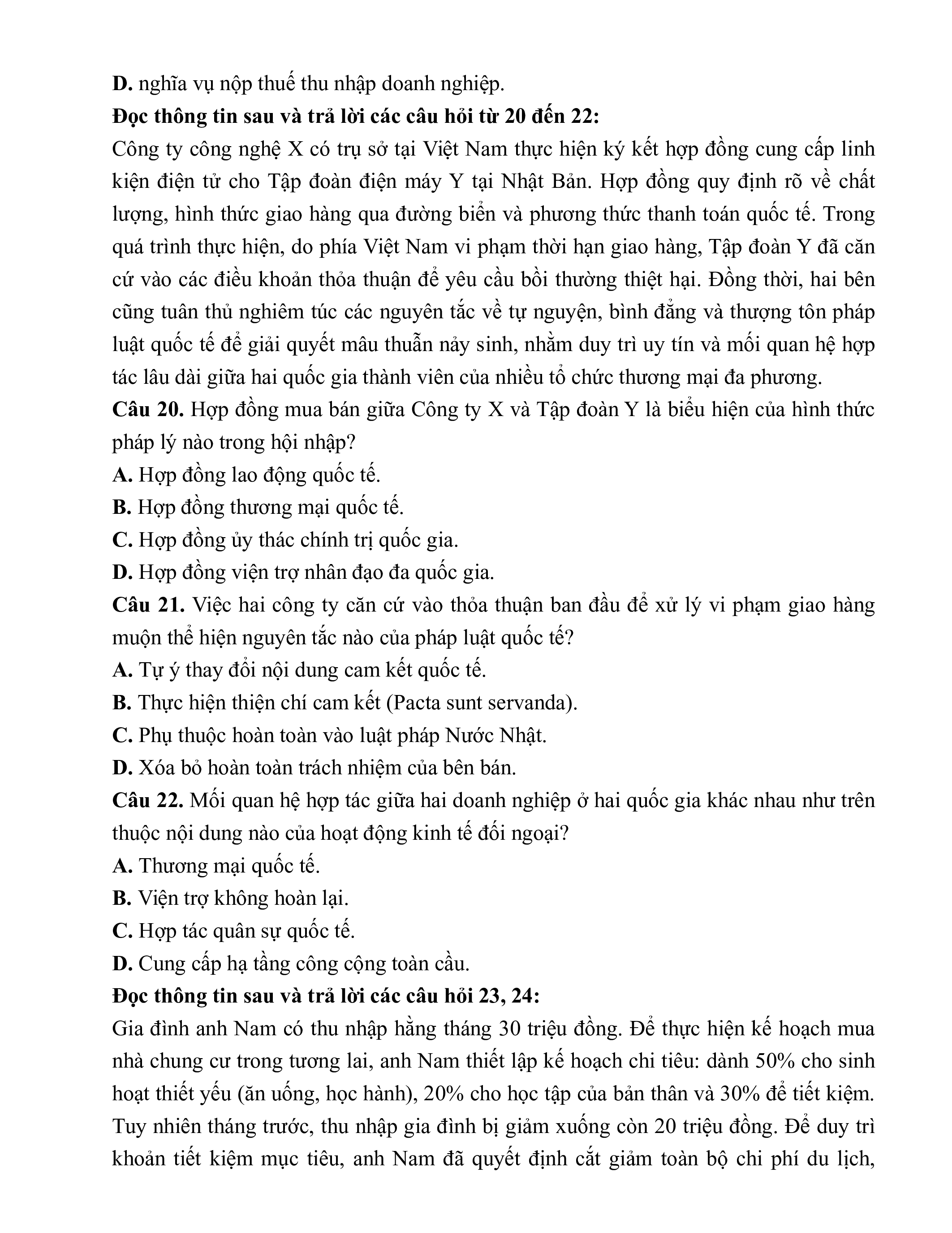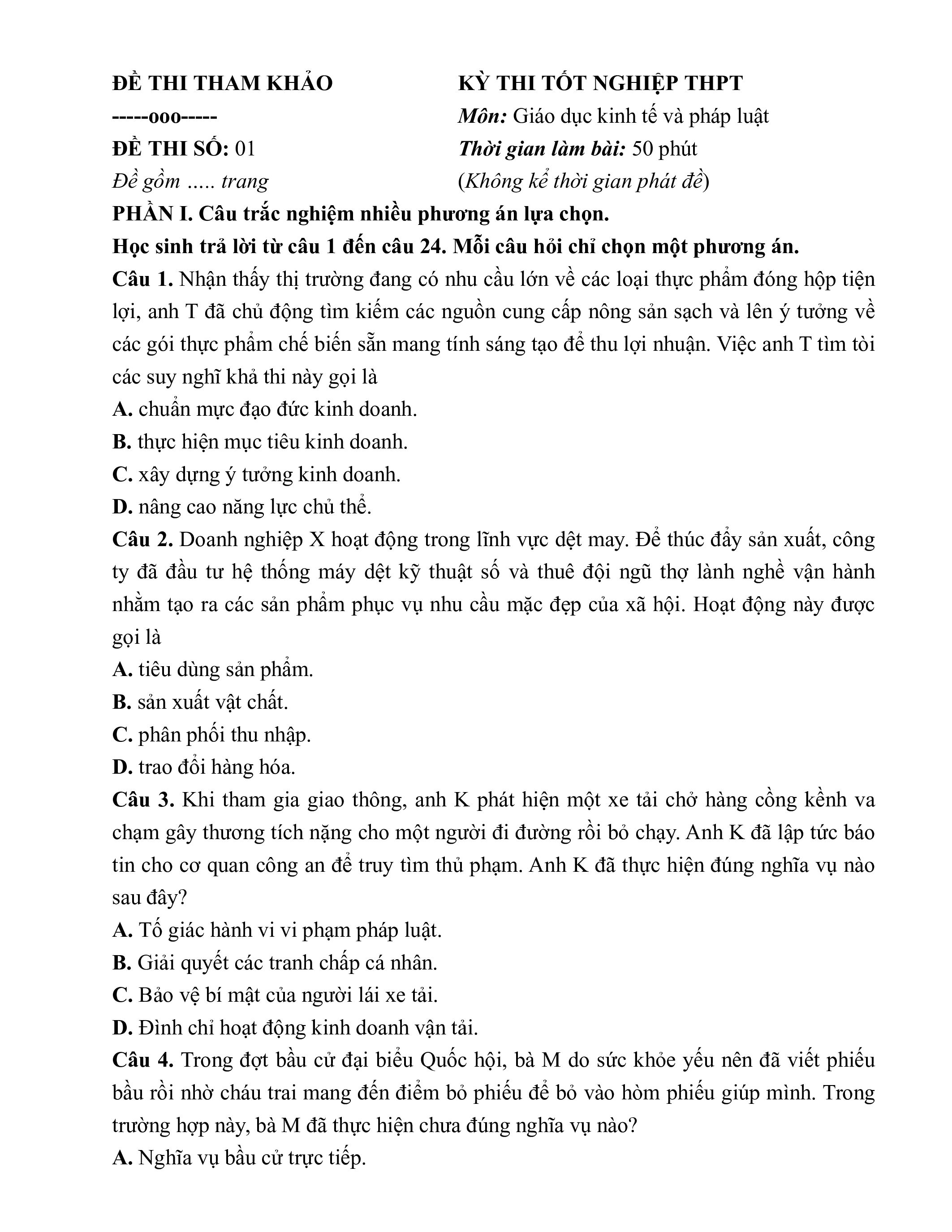 Môn: Giáo dục kinh tế và pháp luật ĐỀ THI SỐ: 01
