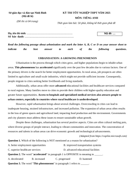 Đề thi thử tốt nghiệp Tiếng Anh 2025 Sở giáo dục và đào tạo Ninh Bình