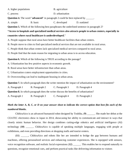 Question 8. In which paragraph does the writer discuss the benefits of urbanisation? A. Paragraph 1 B. Paragraph 3 C. Paragraph 4 D. Paragraph 2