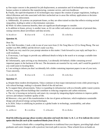 e. I am writing to inform you that I accidentally left a folder containing important papers in one of your taxis. Yours sincerely, A. e-a-d-c-b B. d-a-c-e-b C. c-e-d-a-b D. e-d-c-b-a Question 17.