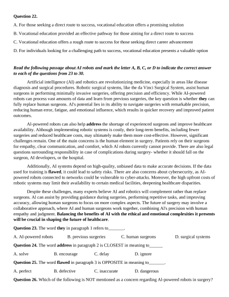 Read the following passage about vocation education and mark the letter A, B, C, or D to indicate the correct