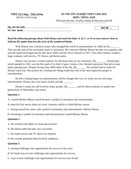 Đề thi thử tốt nghiệp Tiếng Anh 2025 THPT Gò Công Đông - Tiền Giang