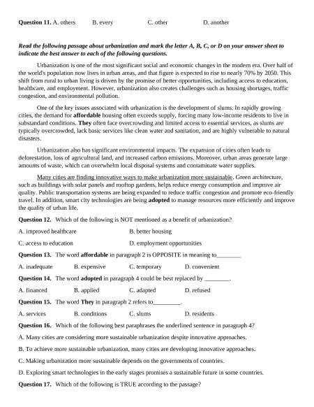 Question 12. Which of the following is NOT mentioned as a benefit of urbanization? A. improved healthcare B. better housing C. access to education D. employment opportunities