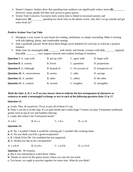 Question 10. A. conversations B. stories C. talks D. sayings Question 11. A. another B. other C. others D. the other Question 12. A. weaken B. worsen C. lengthen D. strengthen