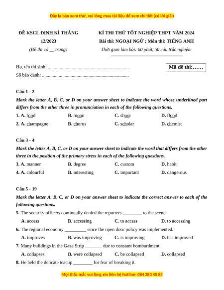 Đề thi thử tốt nghiệp Tiếng Anh Đề khảo sát chất lượng định kỳ năm 2024