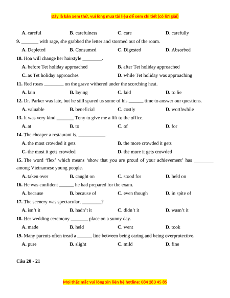 19. Many parents often tread a ______ line between being caring and being overprotective. A. pure B. slight C. mild D. fine Câu 20 - 21