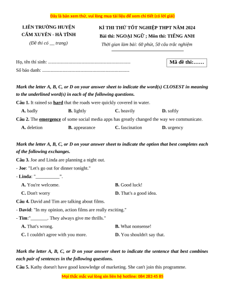 Đề thi thử tốt nghiệp Tiếng Anh Liên trường Huyện Cẩm Xuyên - Hà Tĩnh năm 2024
