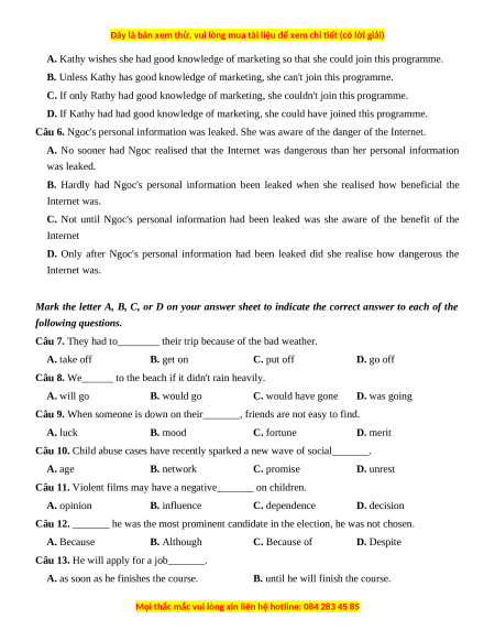 Câu 7. They had to________ their trip because of the bad weather. A. take off B. get on C. put off D. go off