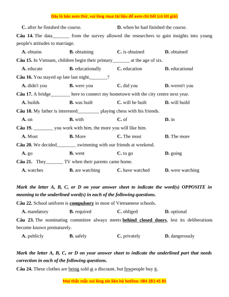 Câu 22. School uniform is compulsory in most of Vietnamese schools. A. mandatory B. required C. obliged D. optional