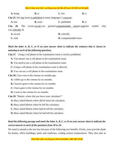 Câu 27. Using a cell phone in the examination room is strictly prohibited.