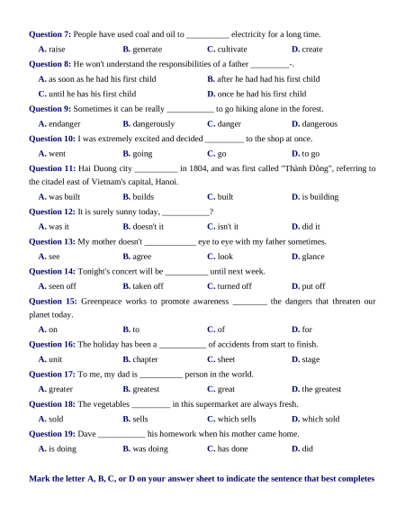 Question 7: People have used coal and oil to __________ electricity for a long time. A. raise B. generate C. cultivate D. create