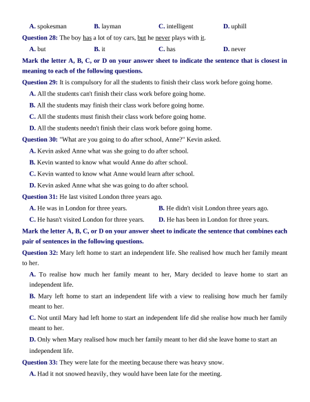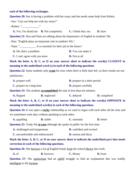 Question 27: The spokesman had an uphill struggle to find an explanation that was readily intelligent to the layman. A. spokesman B. layman C. intelligent D. uphill